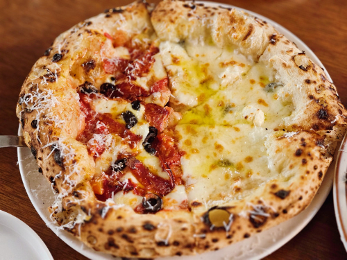 오른쪽의 콰트로 포르마지 피자는 이름에서 알 수 있다시피 4가지 치즈가 올라간 피자입니다. 리코타, 고르곤졸라, 파르미지아노 레지아노, 피오르디 라떼 치즈가 올라가 있어요. 녹아서 자연스럽게 섞인 치즈들 위에는 달콤한 꿀이 올라가 있습니다.