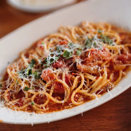 관찰레(돼지 볼살, 턱살을 허브에 절여서 숙성한 것, 베이컨과 비슷하지만 훨씬 지방이 많아요) 가 특징인 토마토소스 스파게티예요.