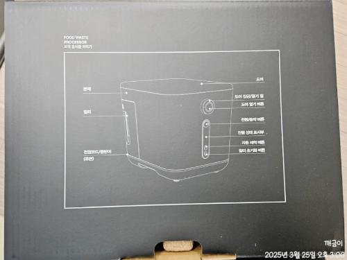 음식물 쓰레기 때문에 스트레스를 제법 받았나 봅니다. 언박싱 사진도 대강 이렇게 찍어놓고 말았네요😓😓 하지만 크게 소개할 만큼 구성이 복잡하지 않았어요. 저 상자를 여니 그냥 바로 본체가 딱! 나옵니다.